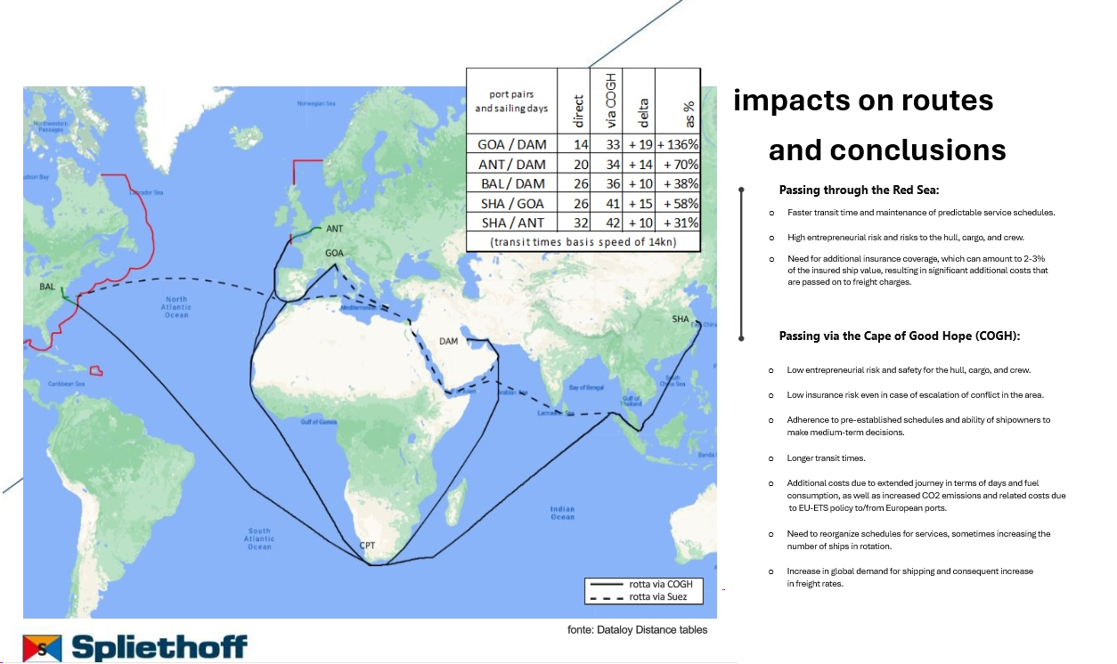 Representatives of the sector’s shipowners who intervened returned from this more technical-operational uncertainty about what to do to a more structural one. “If normally our annual passages through Suez were around 35-40, in the first months of 2024 they are at 0, with 6 ships already rescheduled via the Cape of Good Hope and 4 more to follow in the coming weeks. The first effect of this phenomenon is that embarkation in the Mediterranean is no longer more appealing than that on the European Atlantic coast, and we don’t know if and when it will return to be so,” emphasized Giuseppe Alberti, a broker in the sales and chartering department at Spliethoff.
