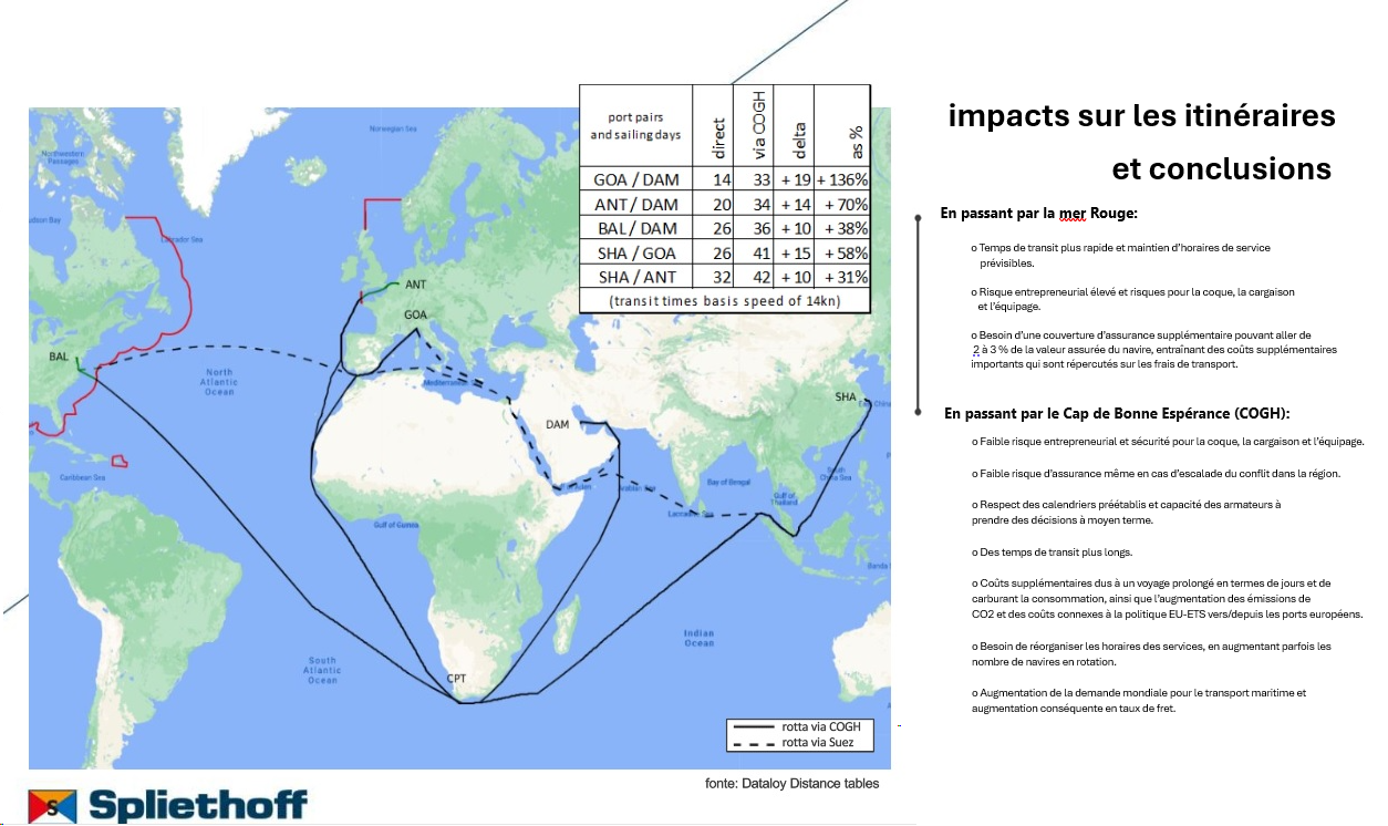 L’abandon de la route via Suez au profit de la circumnavigation de l’Afrique, premier effet sur le commerce mondial de la crise géopolitique au Moyen-Orient, a eu un impact significatif sur les coûts et les délais de transit des transports. Cependant, ce qui préoccupe beaucoup d’opérateurs est presque plus l’impossibilité de planifier l’activité des mois à venir en raison de l’incertitude du scénario.